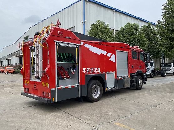 JDF5190GXFPM80/G6型泡沫消防車采用重汽汕德卡ZZ5206N471GF5底盤改裝而成。整車由消防員乘員室和車身兩大部分組成,乘員室為原裝雙排,可乘坐2+4人,該車為外露罐結(jié)構(gòu),車身前部為器材箱,中部為水罐,后部為泵房。