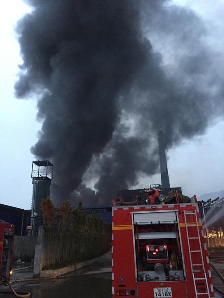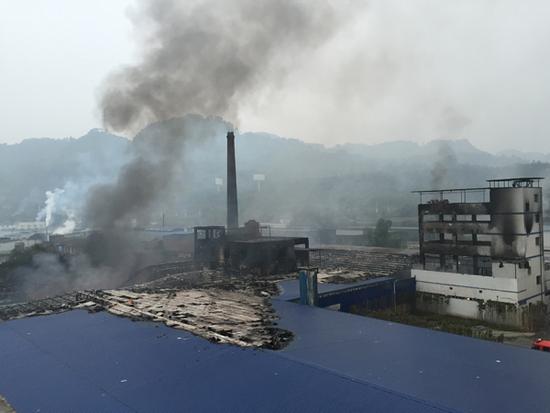 接到報警后,宜賓消防支隊下屬7個中隊、19輛各類消防車、100余名消防官兵迅速趕到現(xiàn)場進行處置,同時,支隊?wèi)?zhàn)勤保障大隊緊急調(diào)集4噸泡沫滅火藥劑趕赴現(xiàn)場。消防官兵到達(dá)現(xiàn)場后,經(jīng)偵查沒有發(fā)現(xiàn)無人員被困。只見現(xiàn)場濃煙滾滾,一棟四層建筑和旁邊兩座鋼結(jié)構(gòu)廠房起火,過火面積較大,廠房石棉瓦頂棚和內(nèi)部可燃物正在劇烈燃燒,燃燒物質(zhì)有油、P2O4有機溶劑和裝硫酸鋅的膠桶等,現(xiàn)場情況十分危急。