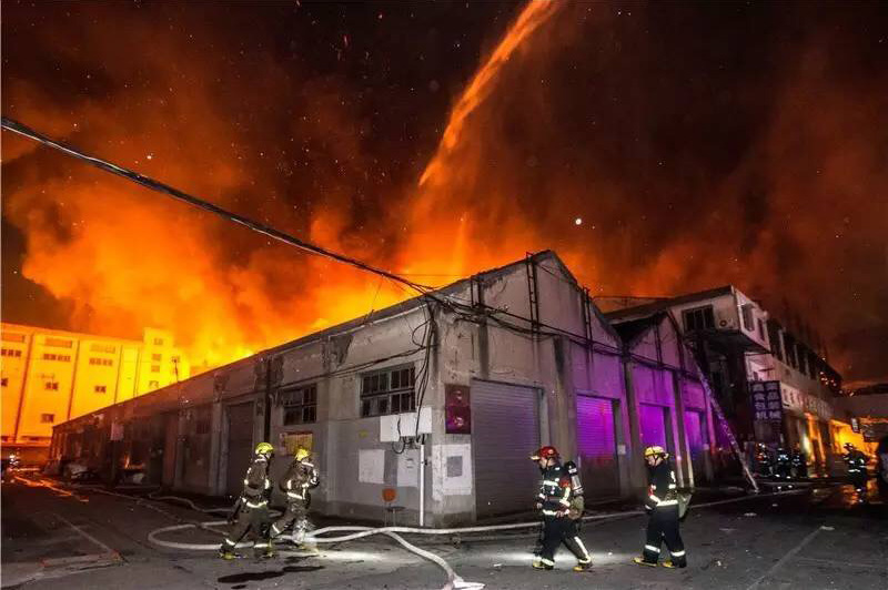 火災(zāi)發(fā)生在東門(mén)大廈北面的一個(gè)城中村,火勢(shì)極大,艮山西路停了40多輛消防車(chē),僅留一個(gè)車(chē)道供東向西車(chē)附近的艮山西路和新塘路出現(xiàn)大面積擁堵。圖為火勢(shì)蔓延到周邊倉(cāng)庫(kù),消防員在現(xiàn)場(chǎng)奮力撲救。