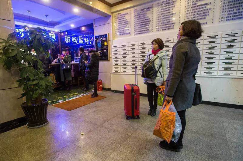 .東門(mén)大廈這邊有兩個(gè)酒店:東門(mén)賓館和布丁酒店。晚上8點(diǎn)多,住客都被叫起來(lái)。“賓館把我們趕下來(lái)了,說(shuō)火勢(shì)太大,怕蔓延過(guò)來(lái)。”布丁酒店一個(gè)年輕女孩蹲在大門(mén)旁邊,呆呆地看著來(lái)來(lái)往往的行人。她實(shí)在無(wú)聊,便抽起了煙。圖為緊鄰火場(chǎng)的一家賓館,住客紛紛退房離開(kāi)。
